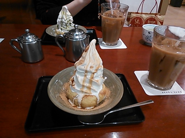 にソフトクリームが乗ってました。ウマウマ。暖かいのと冷たいので相まっていい感じ。のりちょが宇治金時、あたしが黒蜜きなこ。