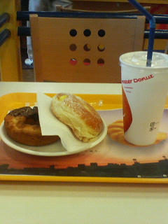 ●遅いお昼です。帰りにミスドで食べました。バニラシェイクとチョコファッションとカスタードクリーム入ってるやつ。オールドファッション系一番すき(*´艸`*)