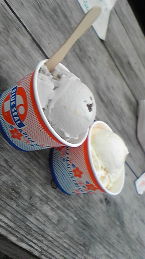 ●んで古宇利島着いたらブルーシールのアイスを初★食べ(*'ω'*)あたし田芋、ちぷん塩ちんすこう。青い海見て~はしゃいで~島一周!ポニー!?が軽トラのおっちゃんに引かれて走って来ました!ちょっとびっくり…o(゜◇゜)o…
