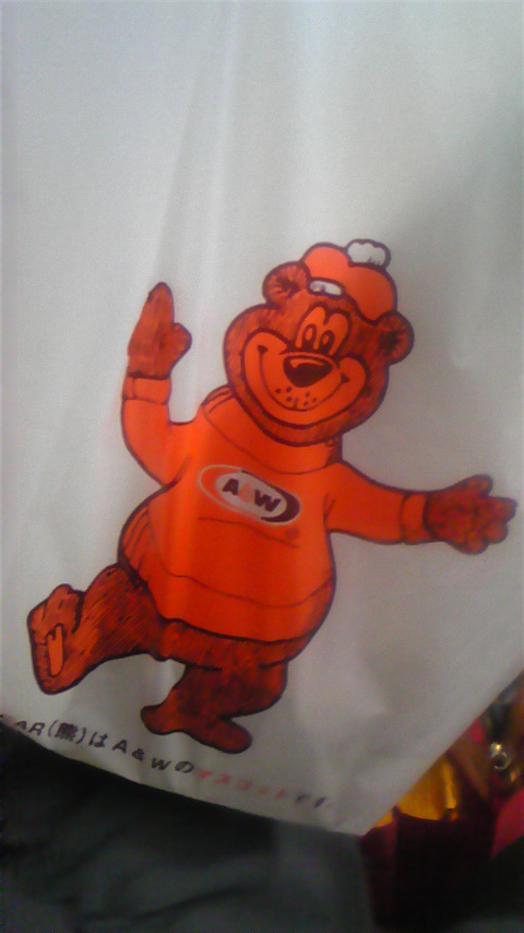 で、夜ご飯~でA&Wという沖縄にあるハンバーガーやさんでご飯購入。アメリカチックなくまさんがキャラクターです。袋にかいてある日本語がなんとなくカタコトに見える…