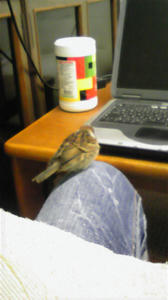 久々のスズメさま。正面で写メ撮れないけど、後ろからひそかに…あたしの足にいます。このあと本気寝に入ったよ!カワユスカワユス!